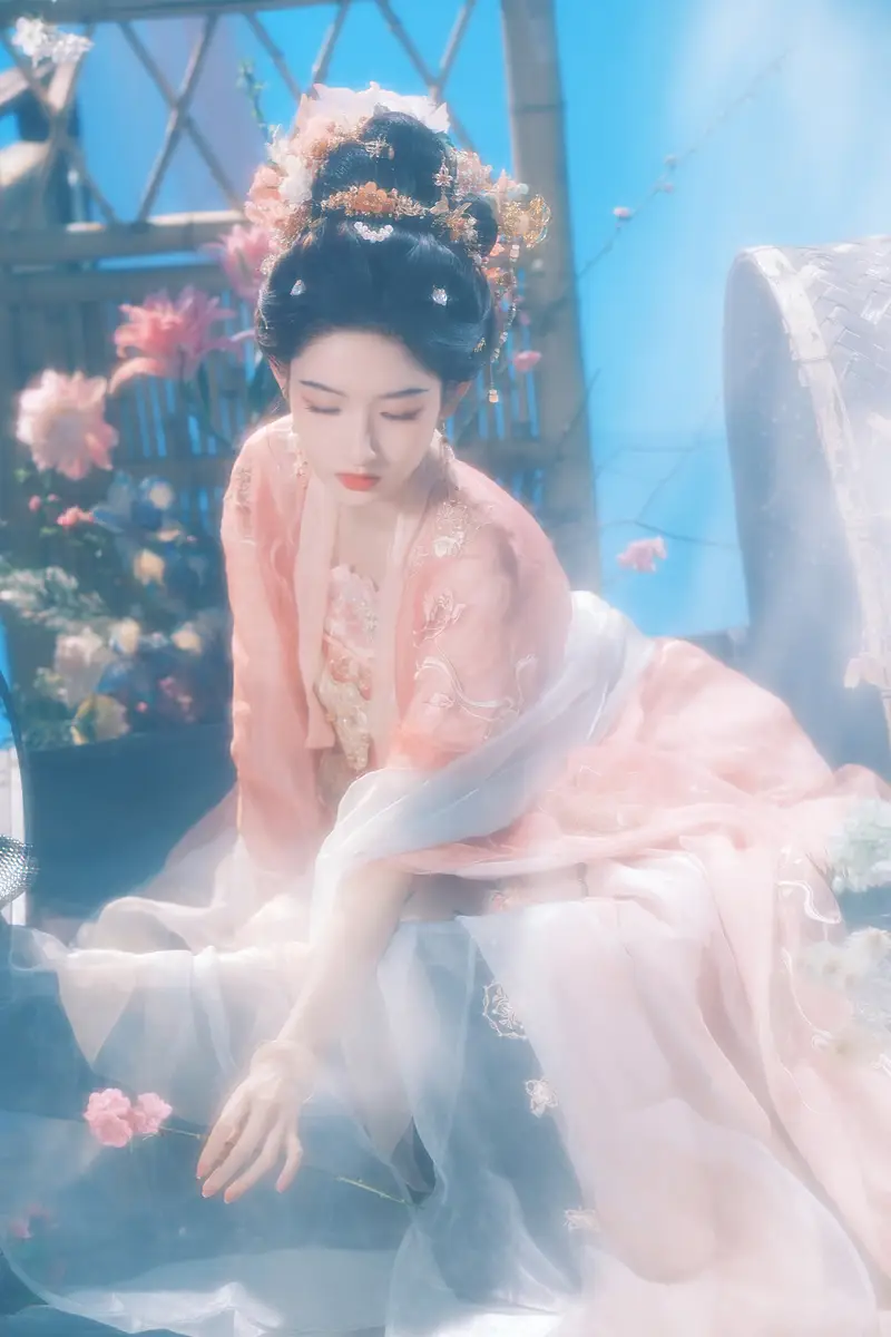 王玉雯身着粉白渐变刺绣汉服,衣料层次细腻,色调柔和自然。她抬眸浅笑,神情间流露出灵动与从容,眼神澄澈而富有诗意。镜头之下,她轻触花枝,在雕花木门与盛放桃花的映衬下,更显古典气质与含蓄之美。