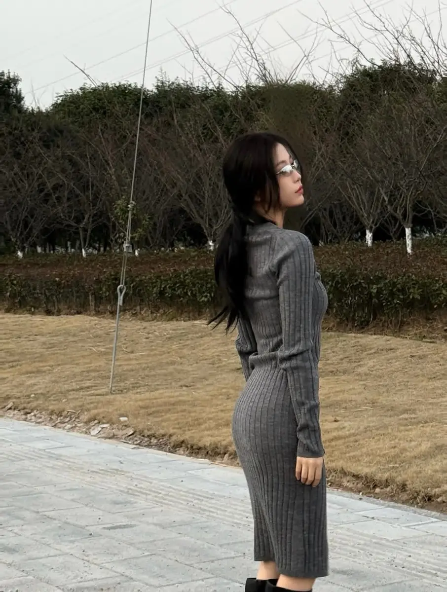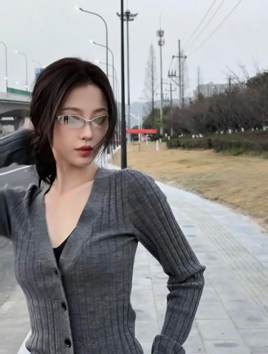 另一套灰色套装造型则展现出截然不同的气质。利落剪裁与简约配色营造出成熟与干练的氛围,同时也凸显出身材线条的层次感。这种从甜美到轻熟的风格过渡,使整组私照更具丰富度,也体现出她在不同风格之间自由切换的表现能力。