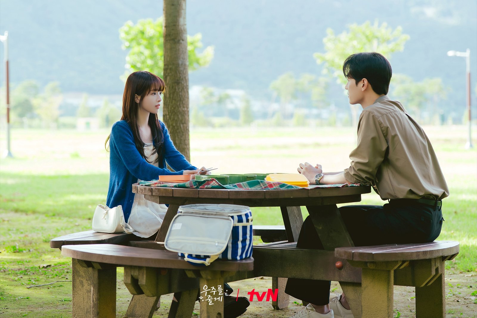另一组剧照则呈现吴贤真与朴允成的野餐约会。两人在安静的公园中交流,使此前告白后的关系走向更加令人好奇。卢正义在这一段落中的犹豫与思考,也为《Our Universe》的爱情线增添现实感。