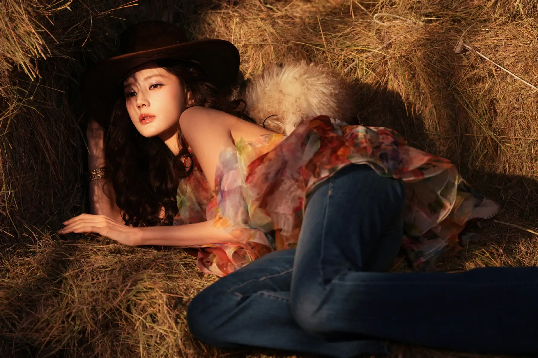 蓬松卷发为造型增添几分俏皮与野性,使西部风格更具层次。李一桐骑黑马回眸的画面飒爽利落,展现出干练气场;而当她躺在干草堆上,彩纱裙随意铺展,又流露出慵懒与柔美。整组写真通过多样化的场景与造型对比,展现了李一桐在复古风格下的多面表现力。