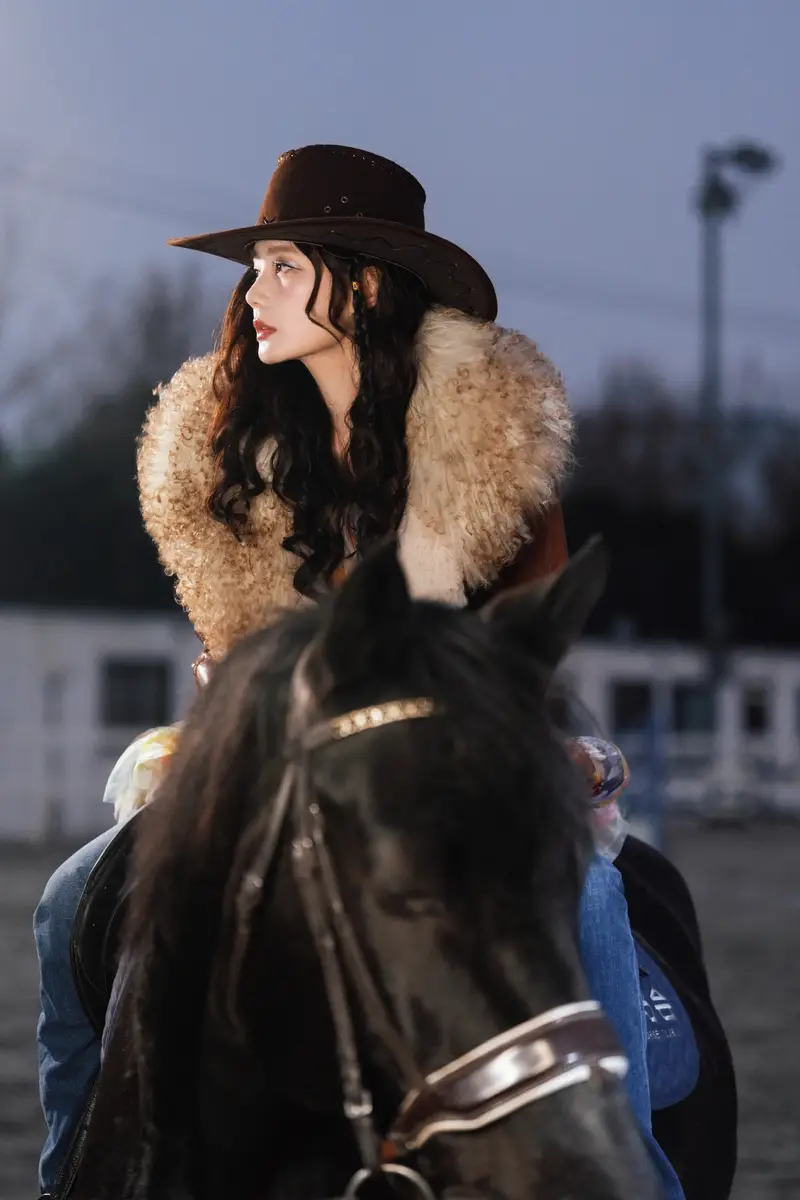 画面里,李一桐骑着黑马,神情自若,在甜美与英气之间自由切换。她倚栏抬眸,目光坚定,复古气质在红调光影的映衬下更加突出,营造出浓厚的氛围感。侧头凝望的瞬间,则显得沉静而富有张力,整体视觉效果兼具故事感与时尚表现力。