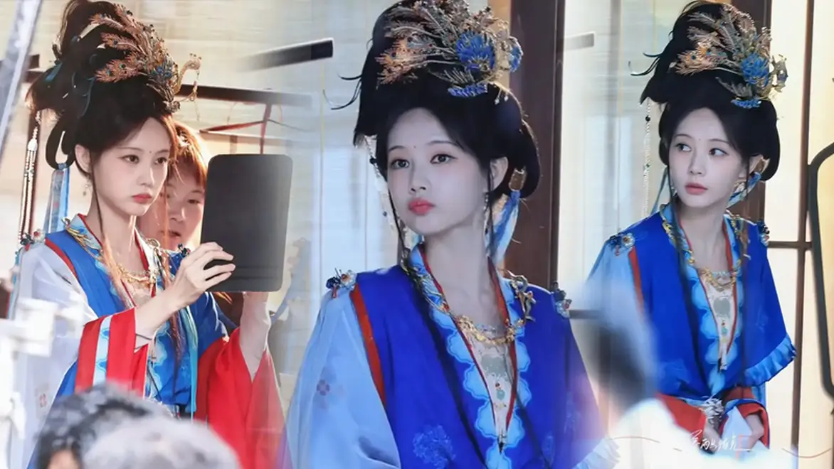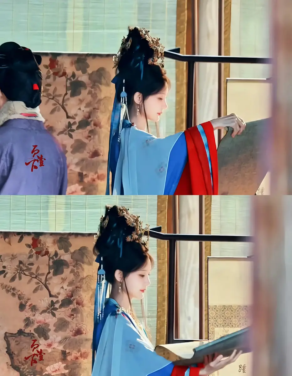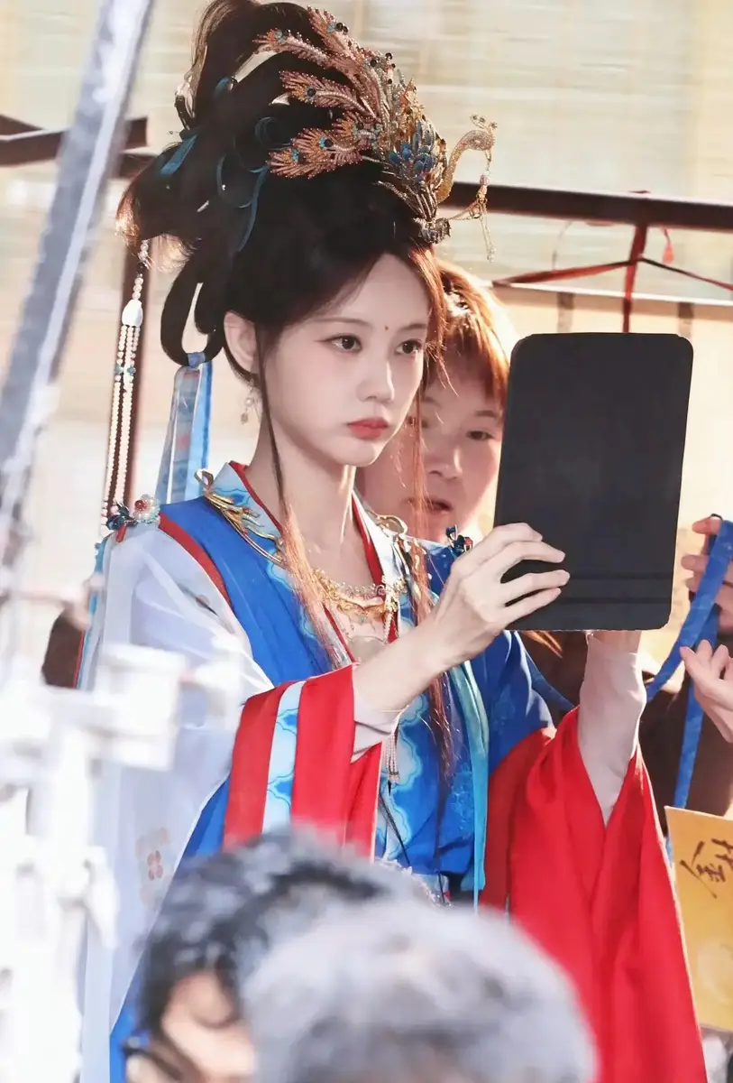 照片里,李一桐身穿蓝色古装,搭配蓝色飘带,衣袂层叠之间更显灵动飘逸。眉间点缀红色花钿,为整体冷色调造型增添一抹亮色,使人物形象更具层次感与辨识度。蓝衣与红色花钿的搭配相互映衬,展现出娇艳动人的视觉效果,也凸显了李一桐独特而鲜明的气质。