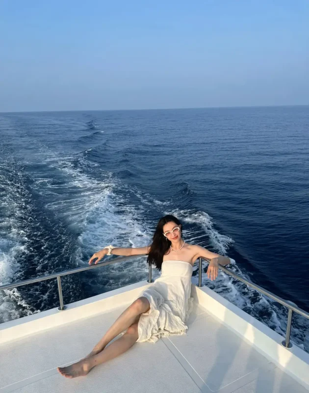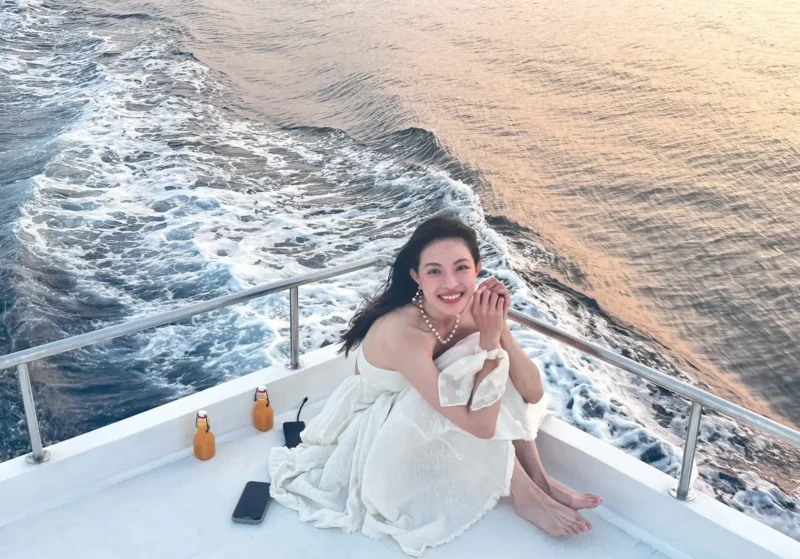 画面里的钟楚曦面带标志性笑容,神情自在随性,尽显轻松愉悦的假日心情。简洁的白色抹胸裙勾勒出流畅线条,与海岛风光相得益彰,整体造型清爽大方,展现出从容自信的气质。置身马尔代夫的自然景色之中,她的造型更显明艳动人。