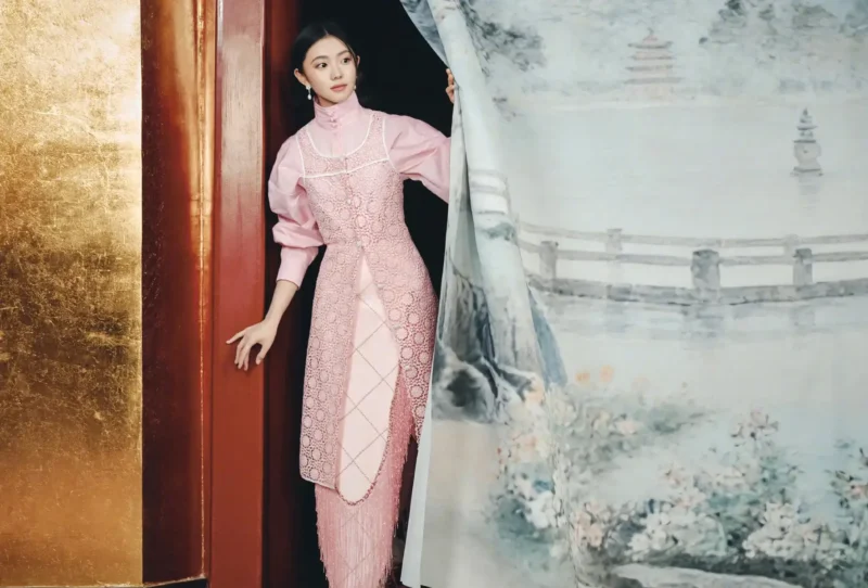 传统元素同样贯穿其中。刘浩存身穿粉色蕾丝旗袍,温婉动人,细腻质感衬托出柔和气质。轻掀画轴的画面,则营造出古典意境,尽显东方美学韵味。此外,她还以撞色礼服裙造型出镜,整体设计简约素雅,高开叉剪裁结合舞蹈动作,使画面在克制之中蕴含张力。