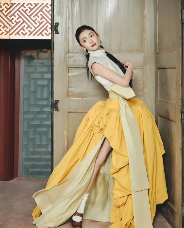 画面中,刘浩存身着黄色长裙起舞,高开叉设计随着舞步摆动,灵动而吸睛。裙摆在动作之间形成流畅线条,与她舒展的肢体语言相呼应,使整体画面充满节奏感与视觉张力。舞蹈与服装的结合,凸显了她在表演层面的感染力。