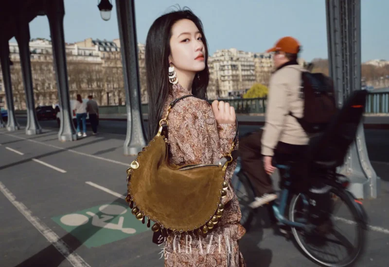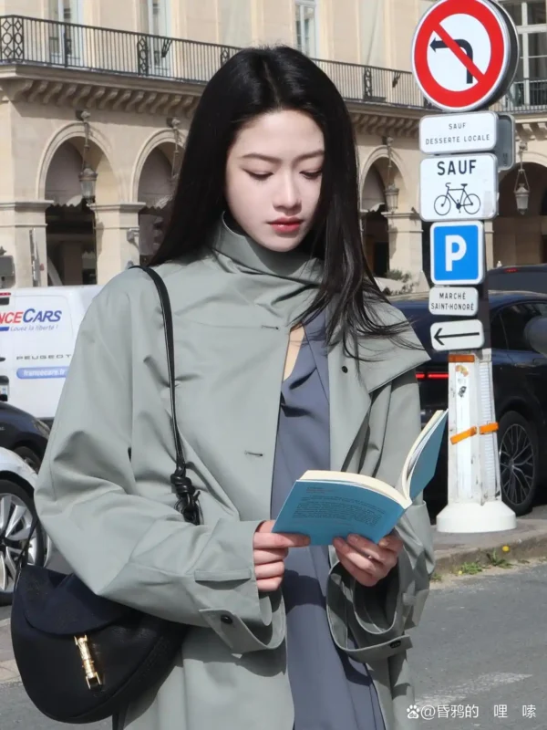 其中一套造型中,向涵之身穿灰绿色风衣亮相,整体气质显得清冷而克制。简洁利落的剪裁搭配低饱和度的色彩,为画面增添了一层高级滤镜般的质感。行走在巴黎街头的向涵之步履随性,神态从容,让整体造型在不经意之间流露出知性与冷静并存的魅力。