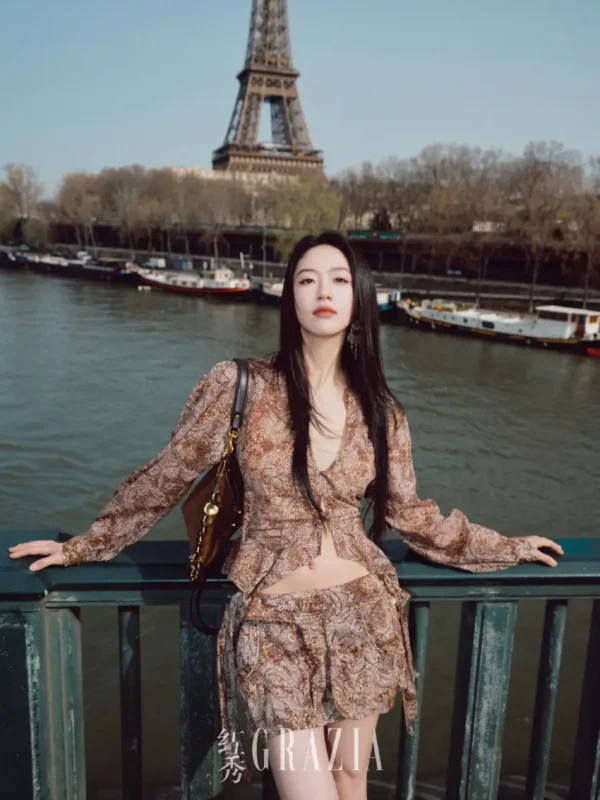 另一组造型则呈现出截然不同的氛围。向涵之身穿印花衬衫搭配流苏元素,复古而浪漫的设计为画面注入了一丝轻盈感。镜头中的向涵之时而俏皮灵动,时而回眸浅笑,少女感与松弛气息交织在一起,使整个画面显得生动而富有层次。