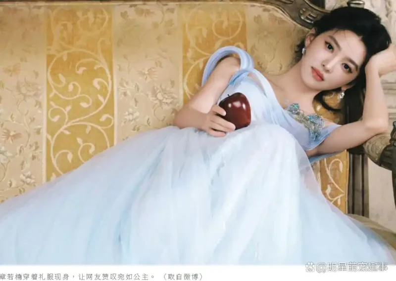 除了时装周的亮相,章若楠 近日还现身自己所代言品牌的直播间。直播中,她身穿水蓝色平口礼服,搭配精致的盘发造型,整体形象宛若童话中的公主。