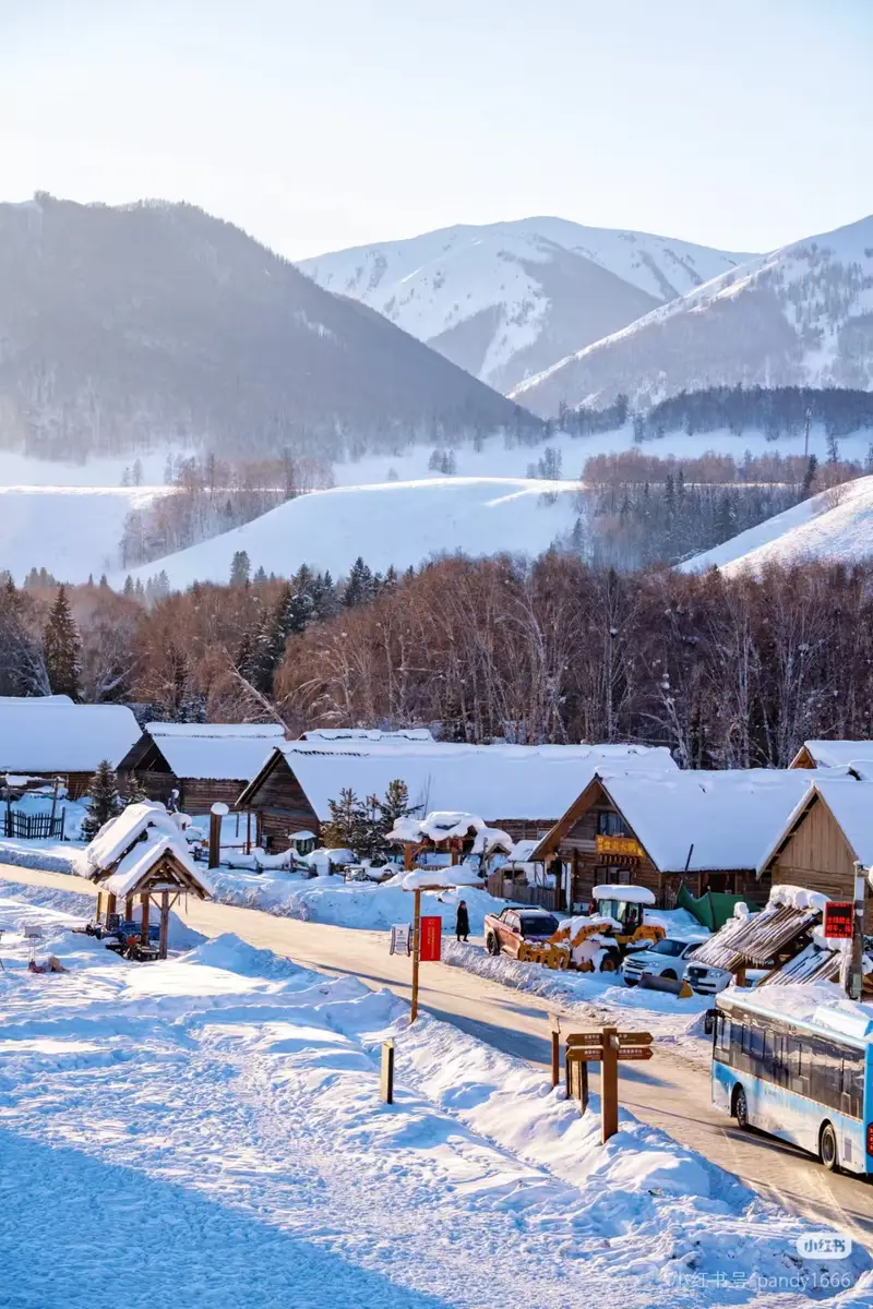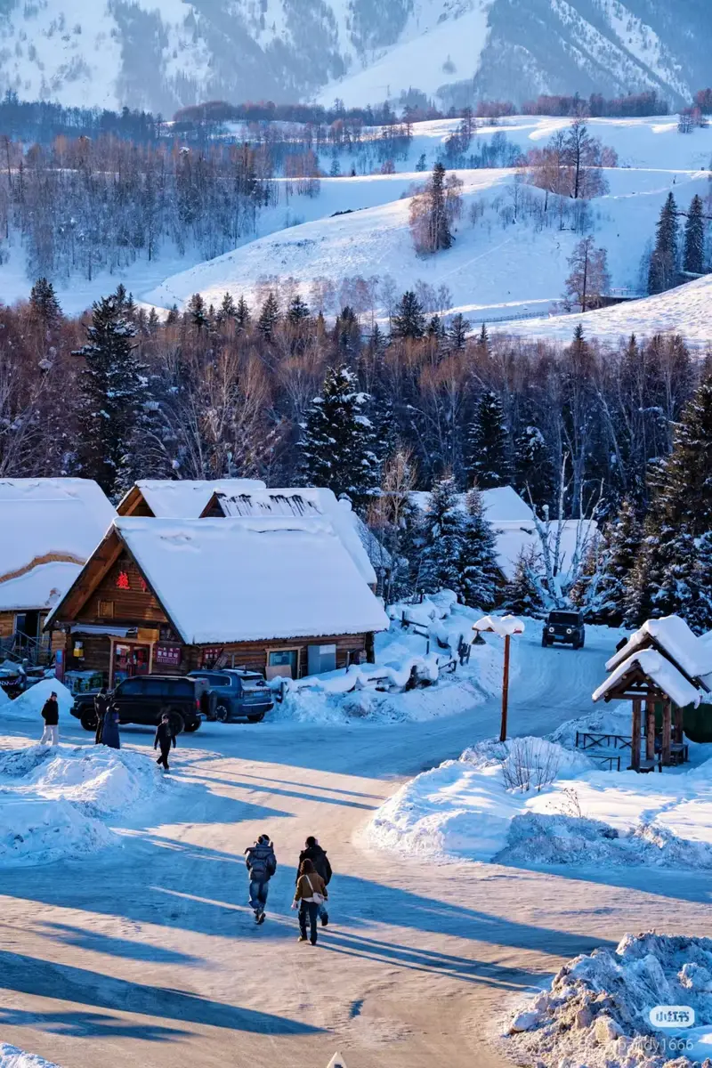清晨时分,村中的原木小屋整齐分布在雪地之中,屋顶覆盖着洁白积雪,在晨光中泛着柔和的光泽。蜿蜒的村道上,旅人三两结伴而行,长长的影子落在雪地上。远处层叠的山峦银装素裹,与近处的林海雪原交相辉映,构成中国旅游中极具代表性的冬日风景。
