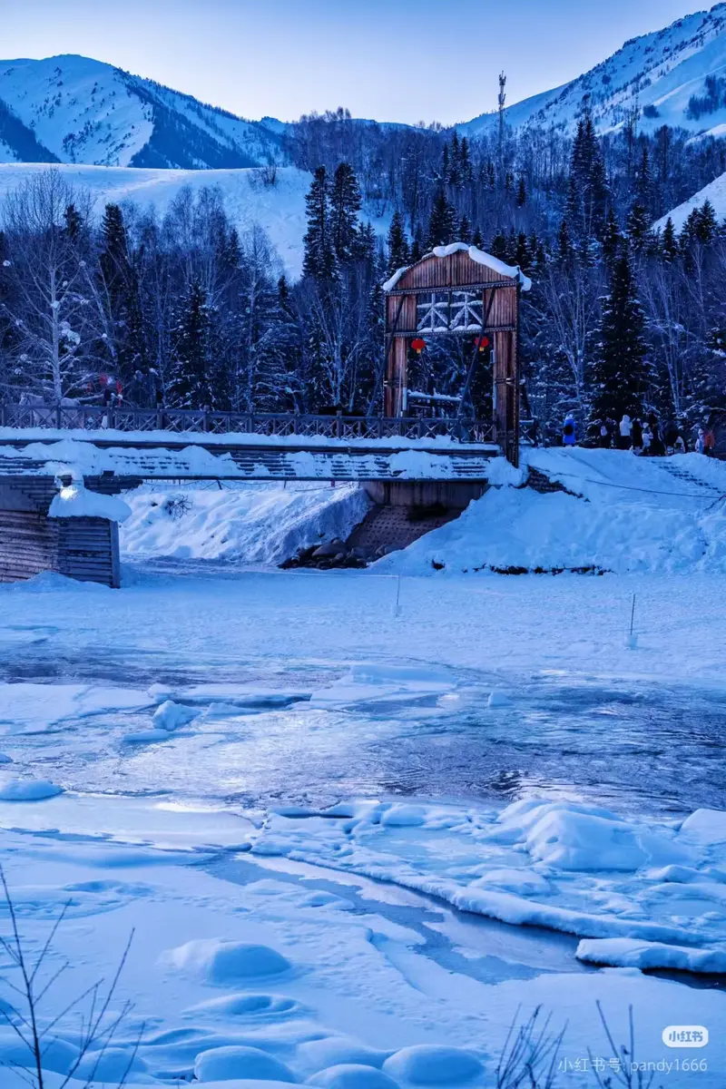 当暮色降临,**禾木桥**在冰雪世界中显得格外古朴厚重。木质桥身覆盖着白雪,桥廊下悬挂的红灯笼在冷色调的天空下格外醒目。桥下河水尚未完全封冻,冰块与流水交织,在月光下泛着幽蓝色光泽。桥另一端的人影与灯火,为这片宁静雪域增添了一丝人间烟火气,也让这里成为中国旅游摄影爱好者的理想取景地。