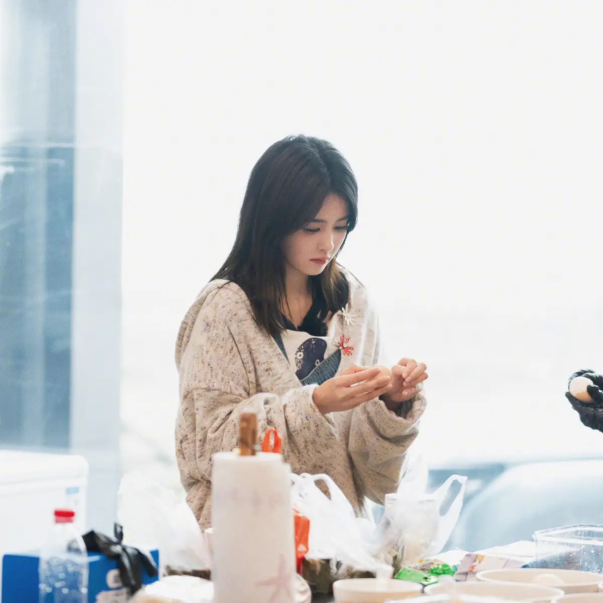 还有画面捕捉到 白鹿 发丝被微风吹起的瞬间,显得格外灵动自然。另一张照片中,她低头专心剥蛋,呈现出一种轻松温馨的居家氛围,也让整组花絮多了几分真实与生活气息。