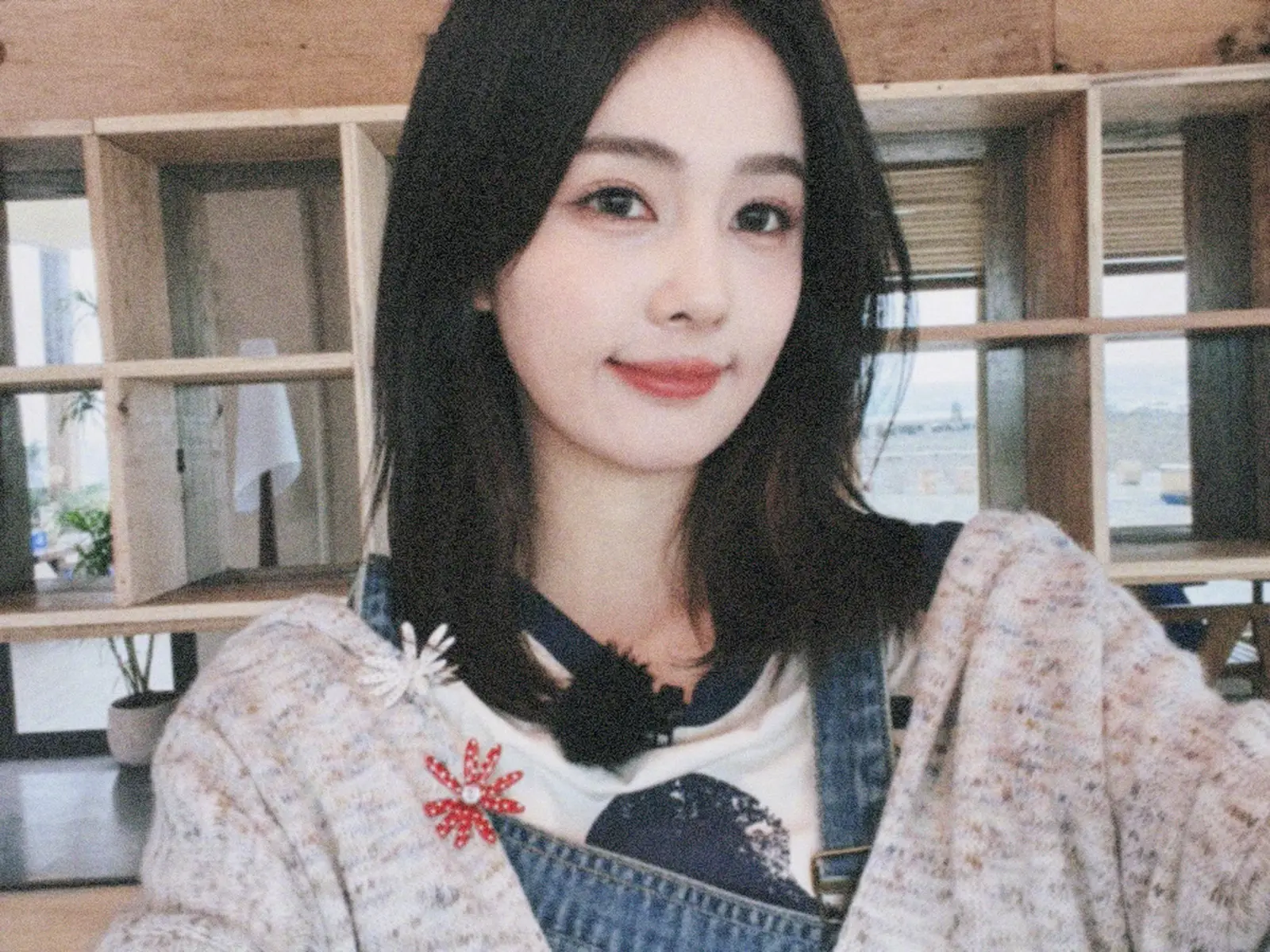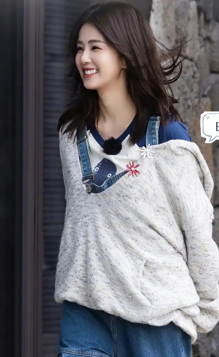 画面中,白鹿 身穿杂色开衫搭配背带裤,整体造型休闲随性又不失温柔感。简约的穿搭让她看起来格外轻松自然,笑眼弯弯的表情更增添了几分甜美气息。