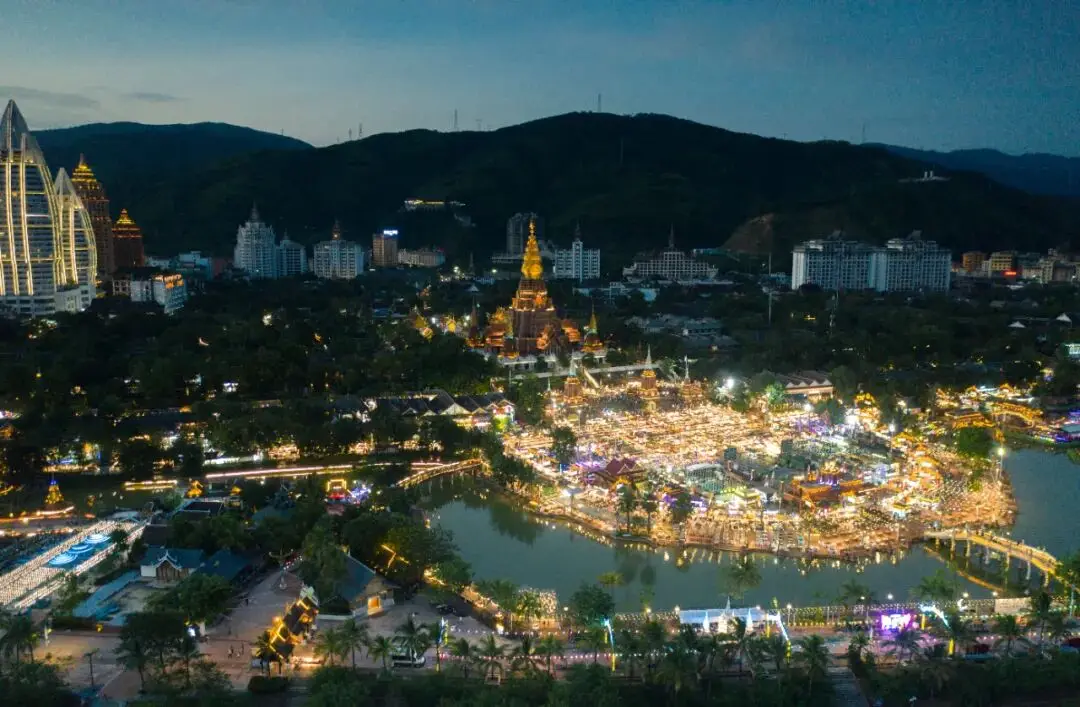 星光夜市依托告庄西双景独特的傣泰建筑群而建,占地规模庞大。当站在大金塔高处俯瞰,成片灯光如星河般铺展开来,数以千计的帐篷在夜色中闪烁,形成极具冲击力的视觉画面。这种立体化与整体化的布局,使其与传统平面夜市形成明显区别。