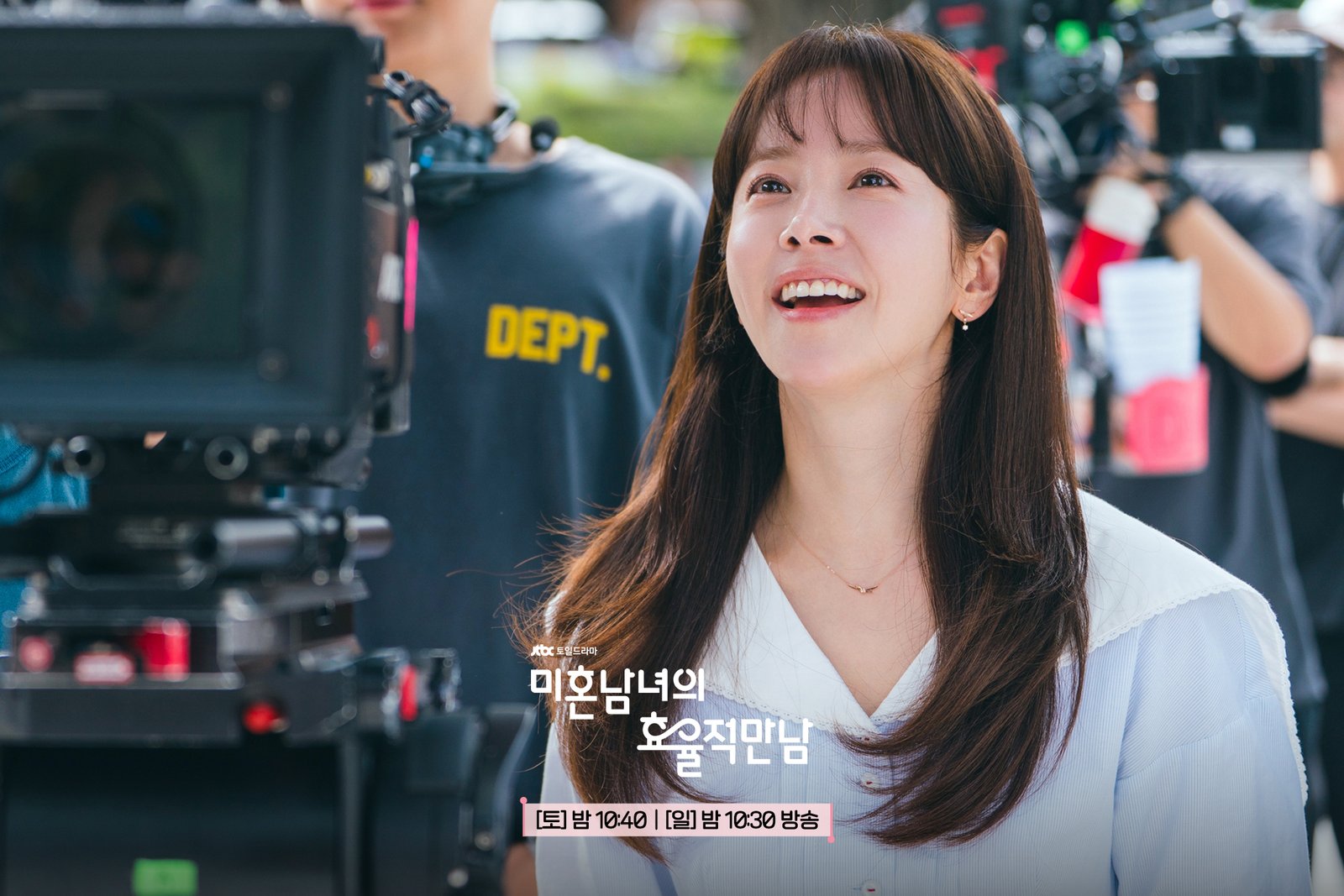 从最新曝光的幕后照片来看,韩志旼在镜头之外展现出与角色截然不同的一面。剧中的李义英对恋爱经验不足,常常在感情选择中显得犹豫不决,而现实中的韩志旼则显得自信从容。她在片场与工作人员轻松互动,脸上始终带着自然的笑容,体现出资深演员的专业与稳定状态。
