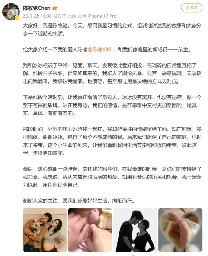 转折点出现在2026年3月28日至29日。陈牧驰与歌手陈冰同步公开结婚及生子的消息,使其个人生活叙事发生明显变化。值得注意的是,这一公开几乎没有前期铺垫,婚姻与子女信息同时披露,形成较强的信息冲击。
