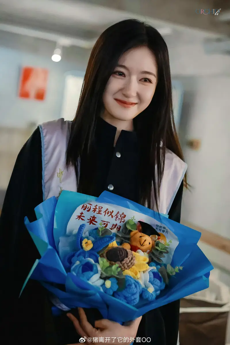 也正是这样的瞬间,让人再次意识到,她身上始终保留着一种很特别的气质:带着明显的“学生气”,却并不局限于年龄本身。那是一种干净、柔软、带点距离感的存在方式,不张扬,也不急于表达,却很容易让人产生亲近感。学士服不过是一个外在符号,但它恰好把这种气质放大,让人产生一种错觉——仿佛她从未真正离开过那个刚毕业的阶段。