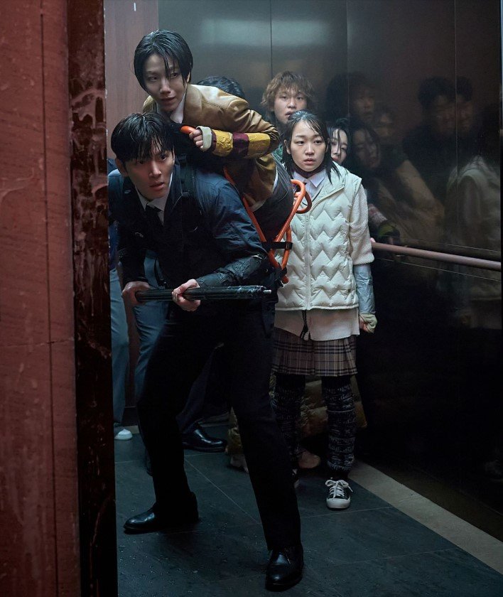 剧照中还出现了坐在轮椅上的崔贤熙,她神情沉稳,似乎在冷静评估局势,展现出与外表脆弱形成反差的内在力量。而由高洙饰演的韩圭成,则在混乱中护送一名受惊的学生,展现出人性中的责任与善意,即便在感染者逼近的瞬间,仍未放弃对他人的守护。