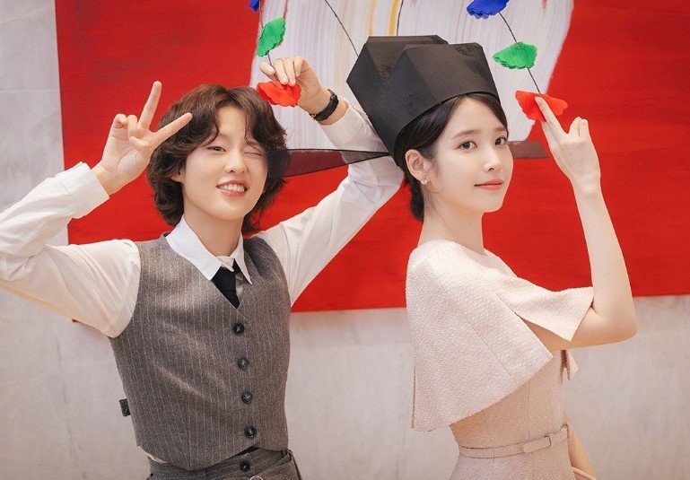在这组花絮中,IU(李知恩)与边佑锡的互动尤为引人注目。镜头里,她戴着带有传统元素的花饰,笑容轻松自然;而他则拿着对讲机,模仿工作人员的样子打趣玩闹,让整个片场多了一层轻快的气息。